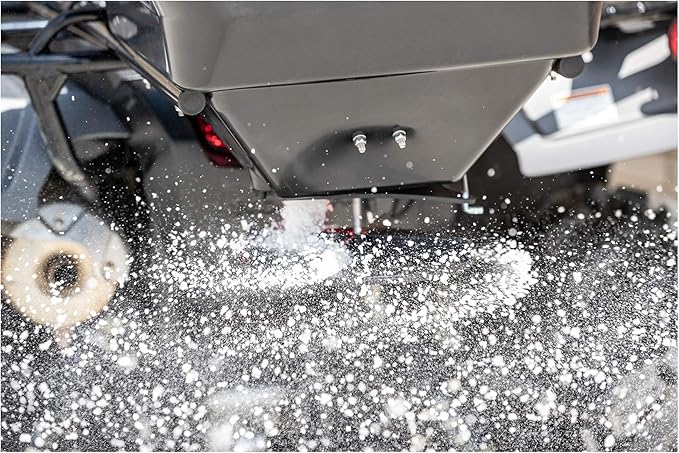 - Easy ATV Mounting: The spreader mounts directly to your ATV's existing rear utility rack, offering a secure attachment that enhances your landscaping, farming, and hunting efforts effortlessly