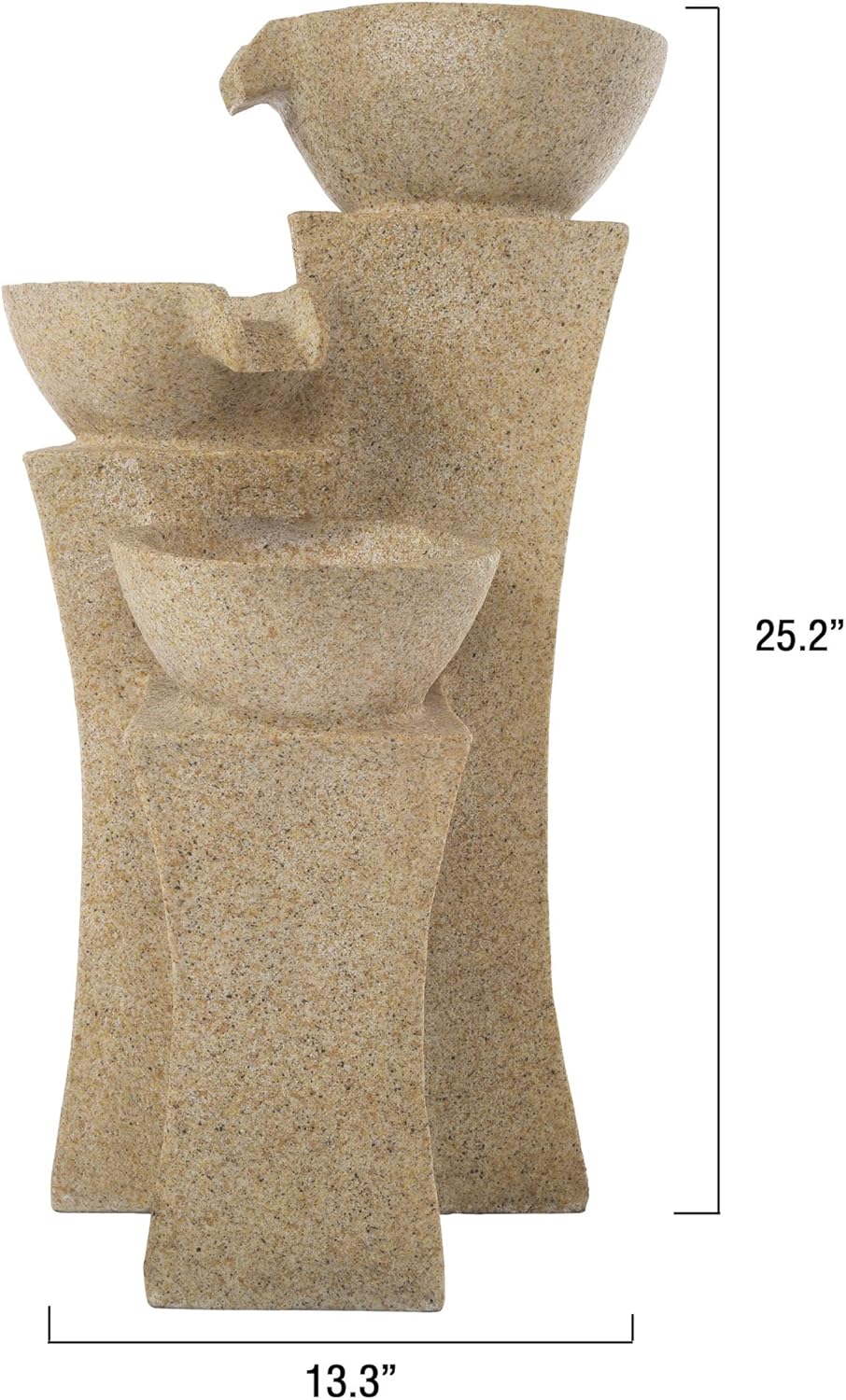 - Fountain Info: Material: Polyresin, Number Of Tiers: 3, Weatherproof: Yes, Indoor/Outdoor Use: Outdoor, Pump Included: Yes