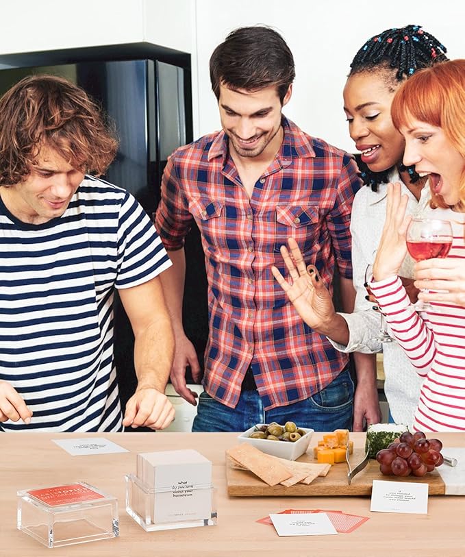 - What You Get: 135 sturdy cards with printed questions held in a stylish, clear cube container.