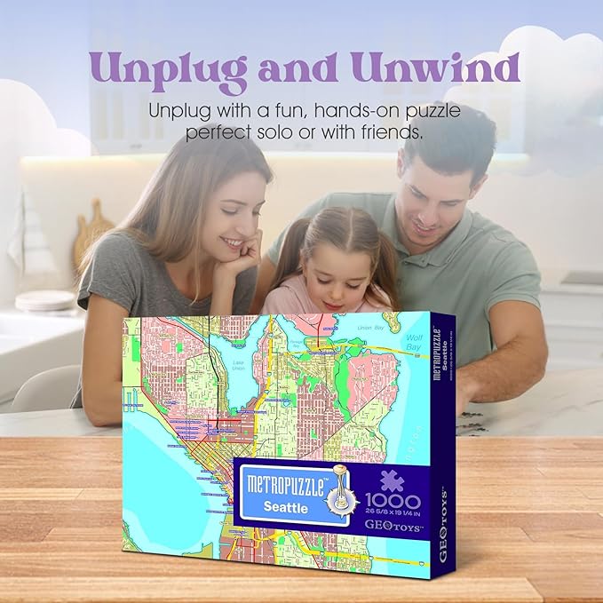 GeoToys Metropuzzle, Seattle Map Jigsaw Puzzles 1000 Pieces - 27 x 19 Detailed Geography Puzzle, Challenging Adult Puzzle, Fun Puzzles for Adults, Map Poster Included for Adults