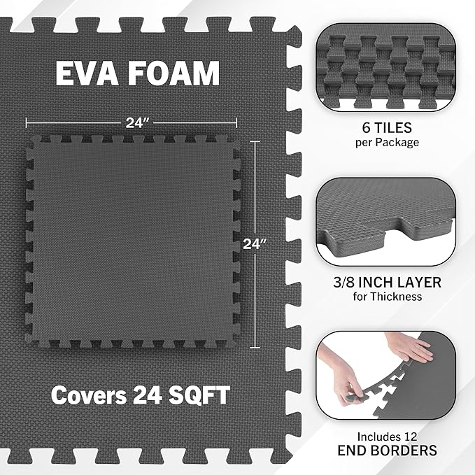 - PRODUCT DETAILS - Materials: EVA Foam. Dimensions: (L) 24” x (W) 24” x (H) 0.40”. 24-Square-Feet of Coverage. Pack Includes 6 Foam Puzzle Floor Mat Tiles and 12 Straight Edge Pieces. Color: Gray.