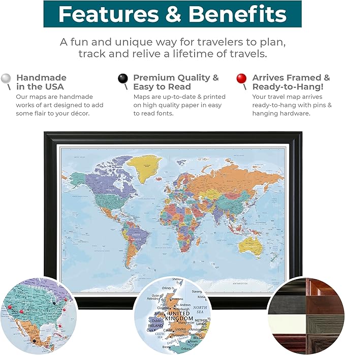 - Handmade in the USA & Ready to Hang – Printed on premium paper and professionally framed, each world travel map is handcrafted and arrives ready-to-hang. A high-quality, meaningful addition to any space that will quickly become your favorite conversation piece