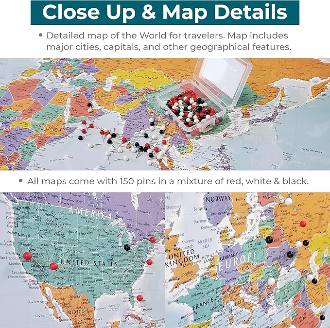 - Includes 150 Travel Pins in 3 Colors – Every push pin map of the world comes with a mix of 150 push pins in red, white, and black so you can mark places you've been, dream destinations, and everything in between. Pin your story your way with our versatile color-coded system