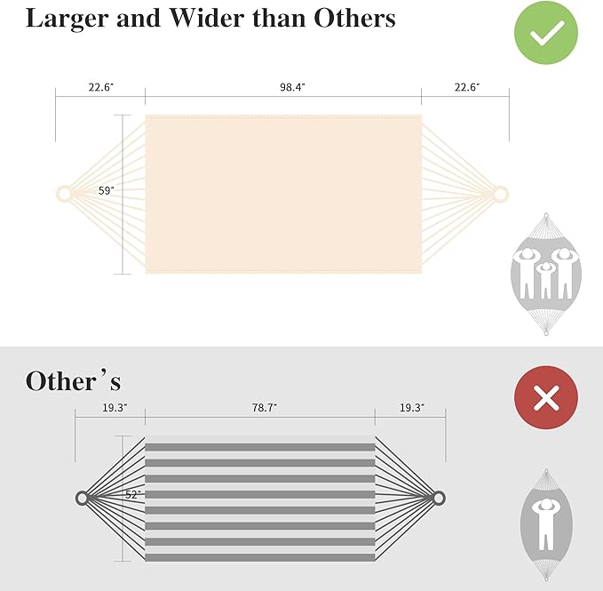 - Larger Bearing Capacity: The heavy duty hammock's total length (from loop to loop) is 144 Inches while the bed size is 98”long X 59”wide, making it perfect for couples