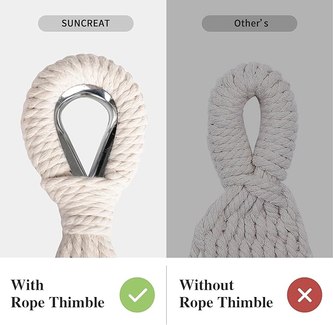 - Handcrafted Ropes: The metal rope thimble is effective for preventing the long-term friction between the tree strap and the ropes, thus prolong the service life of the hammock. The 18 ropes at both ends of the hammock are made of poly-cotton, tightly braided and fixed, which greatly increase the load bearing capacity