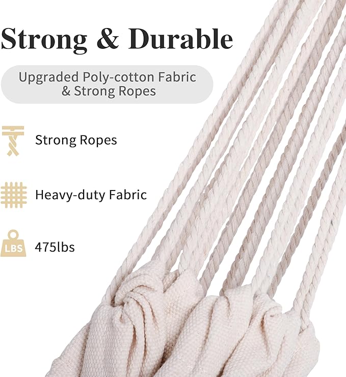 - Upgraded Fabric: Our Brazilian Camping hammock is made of eco-friendly thicker version poly-cotton fabric (no lint, no odor, not pilling, not fading, skin-friendly, and breathable), stronger and much more durable than ordinary fabric hammocks. A comfortable cocoon style hammock can keep you safe while enjoying the peaceful leisure time