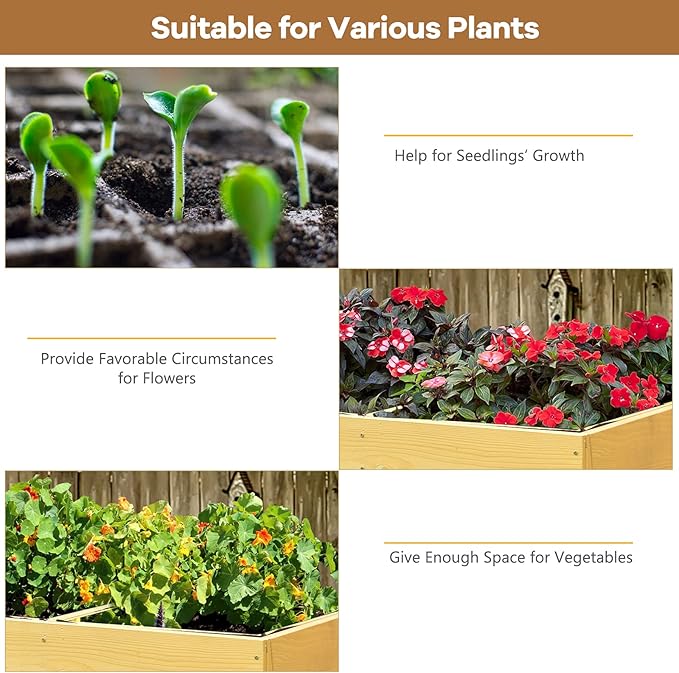 - 【Super Solid Structure】–Our raised bed is wooden structure. More sturdy and durable than plastic ones. And cedar won't easily splinter, warp or crack. With 6 feet, this flower bed can stand well. It will be a great companion to your garden.