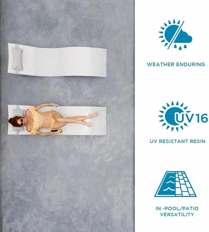 - SAFE FOR ALL POOLS - Whether your pool is saltwater or chlorine, vinyl or fiberglass, commercial or residential, this in-pool lounger works in depths up to 15” of water; or stay dry and lounge on decks, patios and wherever you choose to relax, pool not required.