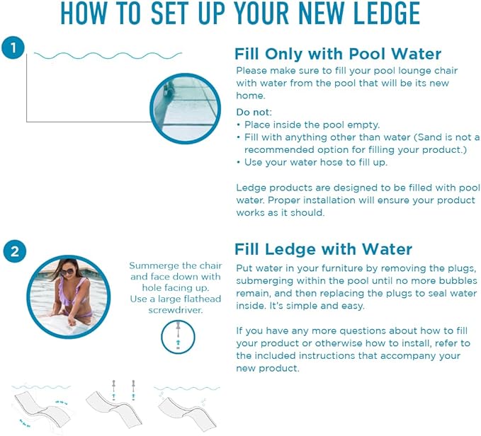 - MINIMAL ASSEMBLY - Fill completely with water to avoid buoyancy in your pool by fully submerging and rotating in the water. Tilt the chaise as you place on your ledge to remove any bubbles or pockets of air away from the feet. Lay back and enjoy your own personal oasis.