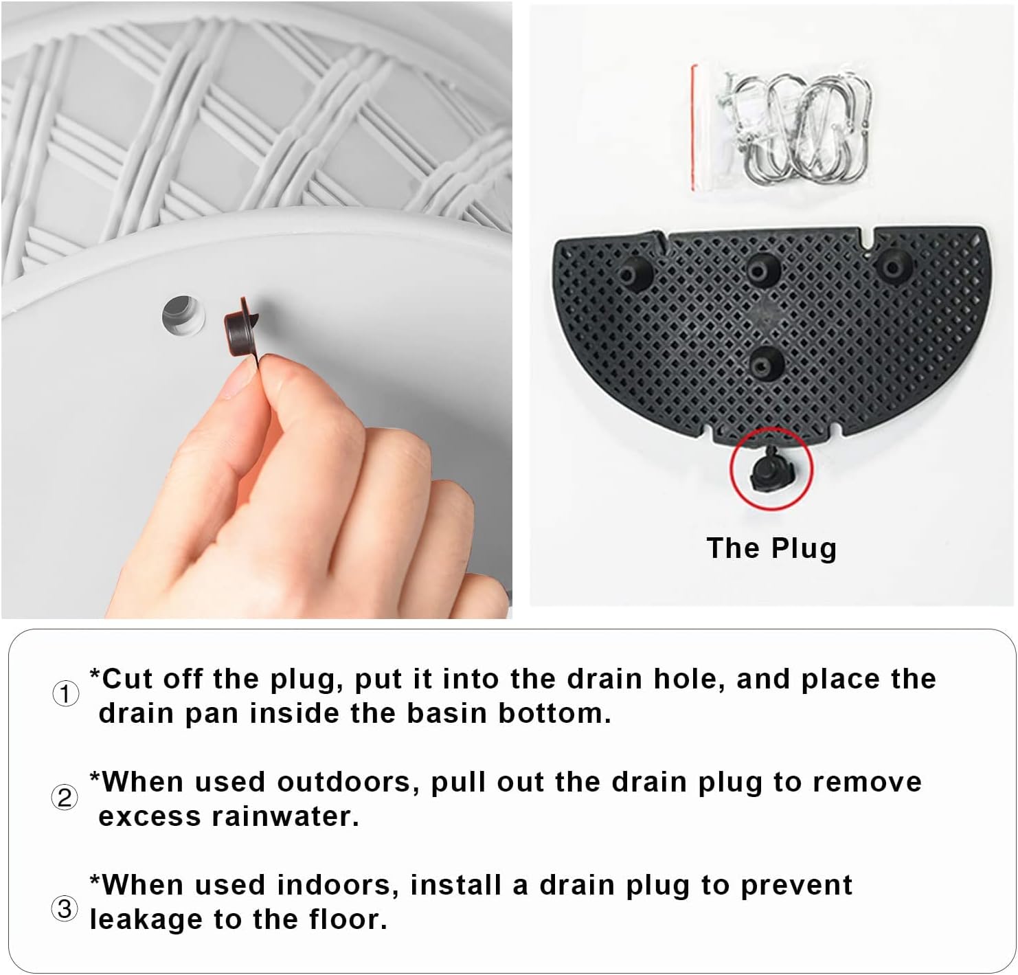 - Use instruction: Cut down the plug and put it into the drain hole,then place the drain pan at the pot bottom. Pull out drainage plug to allow for the removal of excess rainwater when installed outdoors. Install drainage plug when used indoors.
