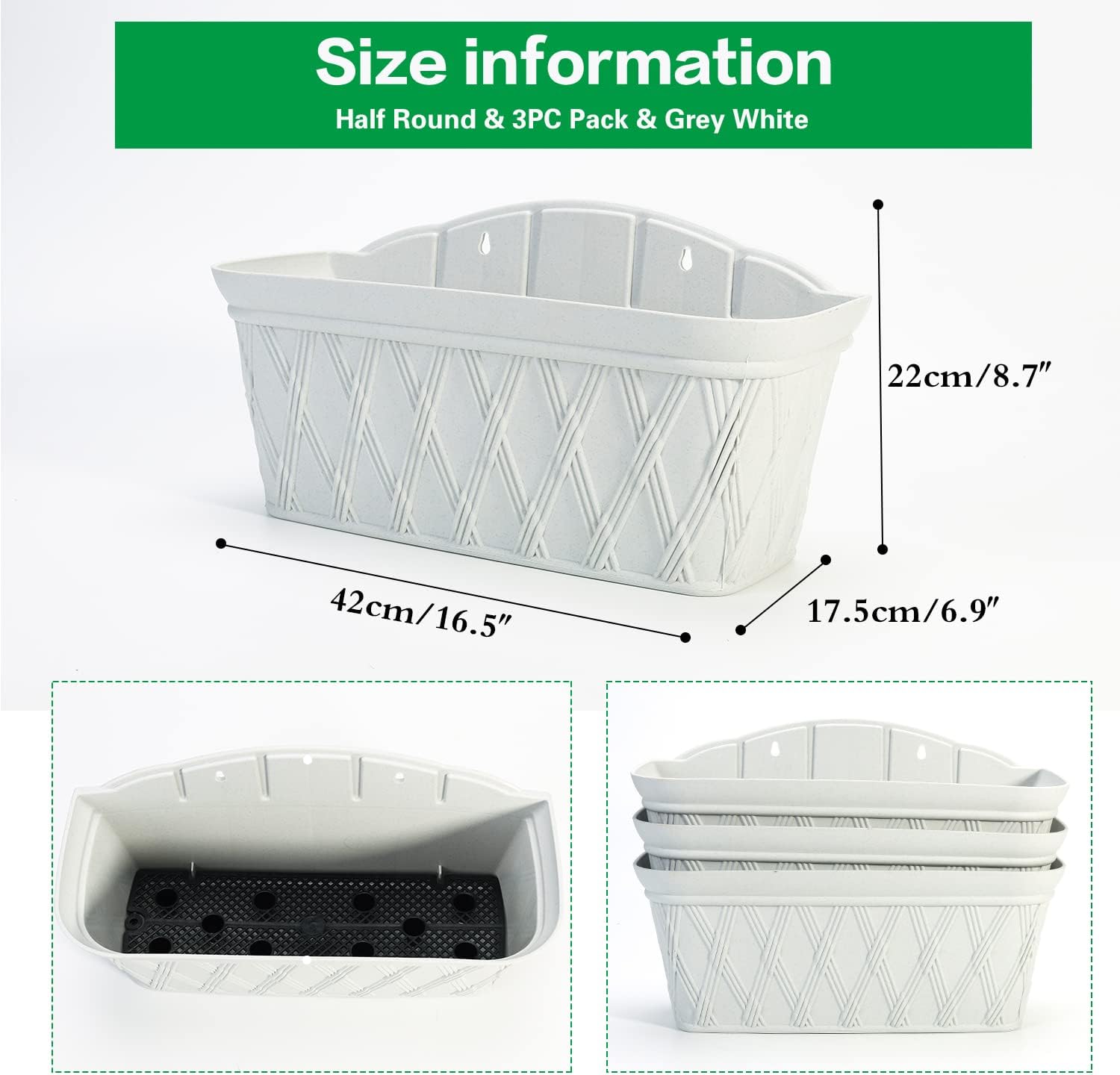 Sungmor 3 Pack Wall Hanging Planters, 16.5 Inch Railing Fence Hanging Flower Pots, Thickened Plastic Water Storage Plant Pot, Indoor Outdoor Garden Balcony Decor, Light Grey Large Plant Basket