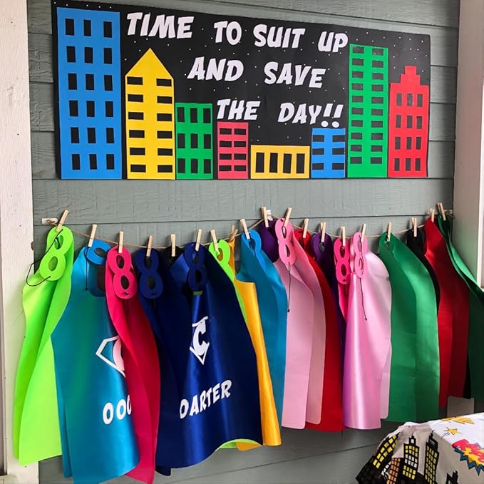 - INCLUDES: 14pcs kids capes + 14pcs color matched superhero masks (Totally 28pcs). IRON The capes before using it due to the fold packing