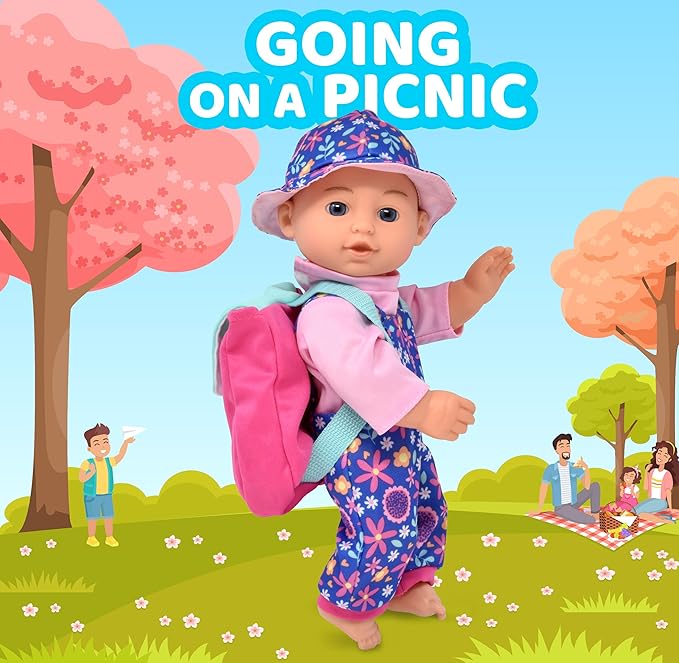 - Comprehensive Set: 12-inch baby doll with realistic diaper bag, bottles, sunglasses, and pretend play feeding accessories.