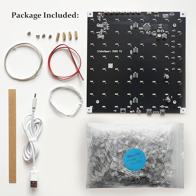 - [LED CUBE KIT] This is a DIY welding package for 3D cube light, a 3D matrix made up of 512 blue square LEDs, which can display a lot of colorful dynamic lighting shapes. It is suitable for students' manual electronic manufacturing courses and welding exercises. Meanwhile, it is also a pretty innovative and meaningful small gift.