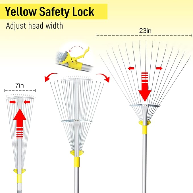 - 【Bigger Leaf Rake Head】- Suitable for Both Wide & Narrow Area. Expand the 7-23" adjustable garden rake head to easily pick up leaves, clippings and loose lawn debris in wide aera. Compact the yard rake for leaves in tight areas like under hedges or between flower beds
