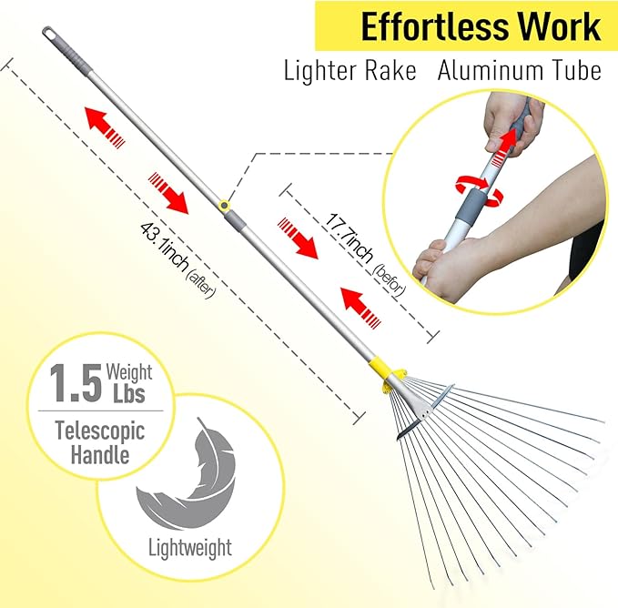 - 【Efficient Raking in Each Pass】- Larger head of this collapsible rake for camping collects more dry leaves in each pass efficiently. Adjust the yard rake head at any width easily in seconds by turning yellow lock anytime