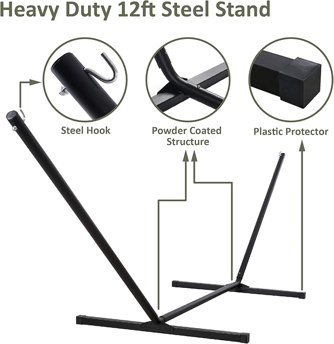 - Freestanding Hammock with Portable Stand: No damage to trees. Created to be stable and long-lasting, the 12 ft stand is made from powder-coated heavy gauge steel. It can be easily assembled in minutes without any tools, and it could be disassembled easily, making it to be a portable hammock. Feel free to contact us if you have any questions during use within one year of purchase. We are always here to help