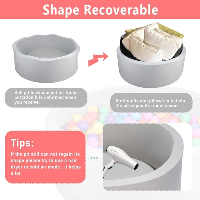 - [Vacuum Sealed Packaging] The ball pit is vacuum-sealed to avoid damage during smart shipping. It expands immediately upon opening, but does not immediately take on a perfect round shape. It can be left for up to 72 hours to recover, and blowing on it with a moderately warm hairdryer or stuffing the empty ball pit with pillows and blankets will go a long way toward restoring the shape. If you have any comments or suggestions about the product, please feel free to contact us.