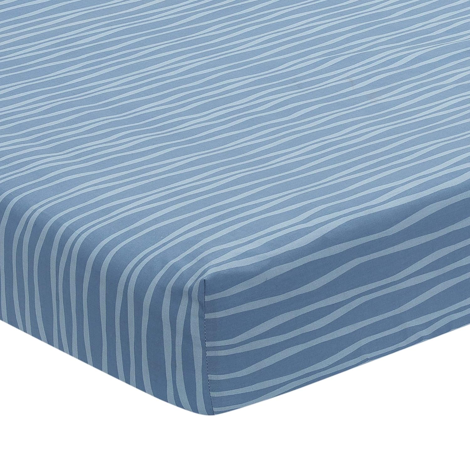 - Two baby/toddler fitted crib sheets are included, one is a breathable 100% Cotton tossed dino print on a white ground and the other is a blue blended fabric with wavy lines.