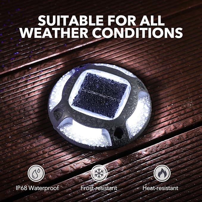 - 【IP68 WATERPROOF SOLAR LED DECK LIGHTS】With an IP68 waterproof design and a tightly sealed battery compartment, these solar driveway reflectors lights can resist any terrible weather, like a rainstorm, or daily heat.