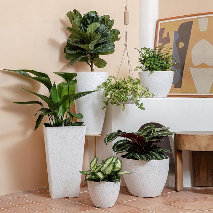 - LIGHTWEIGHT MATERIALS AND ADJUSTABLE HANGER- Made from durable recycled plastic and natural stone powder, these planters are light enough to hang anywhere indoors and outdoors. Feel free to adjust the height to your liking with its sturdy heavy-duty triple rope hanger. The concrete-like appearance gives these hanging flower pots a natural look without the weight.