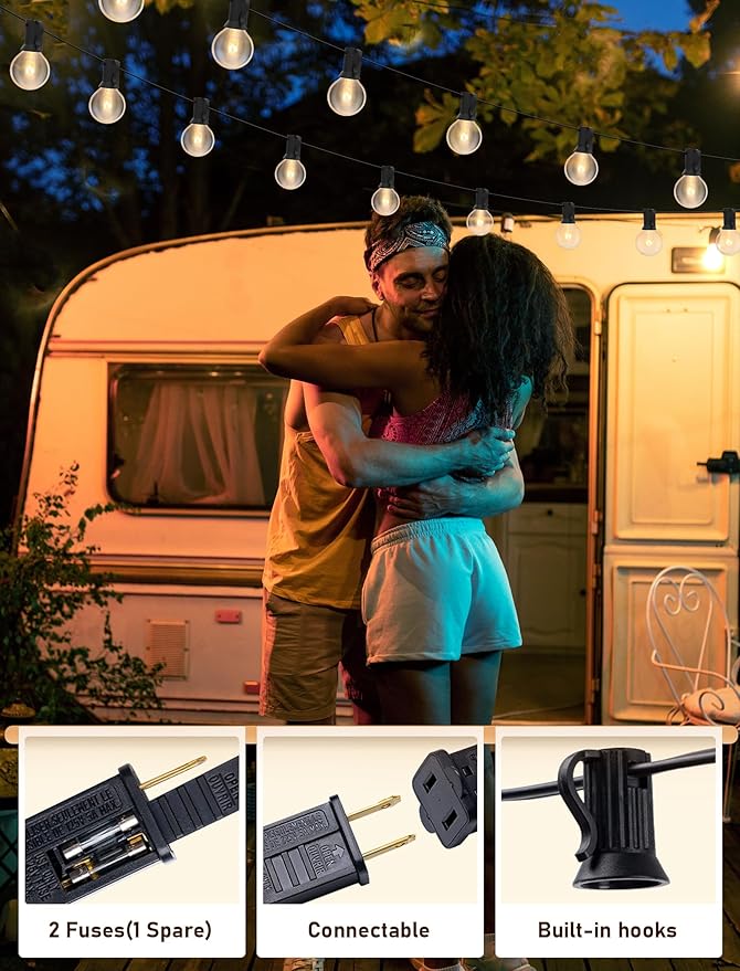 - 50 feet Globe string lights with 52 G40 5 Watt Edison clear Bulbs, G40 candelabra (E12)plastic socket base.The male plug contains double fuse.UL listed( 2 Spare Bulbs)