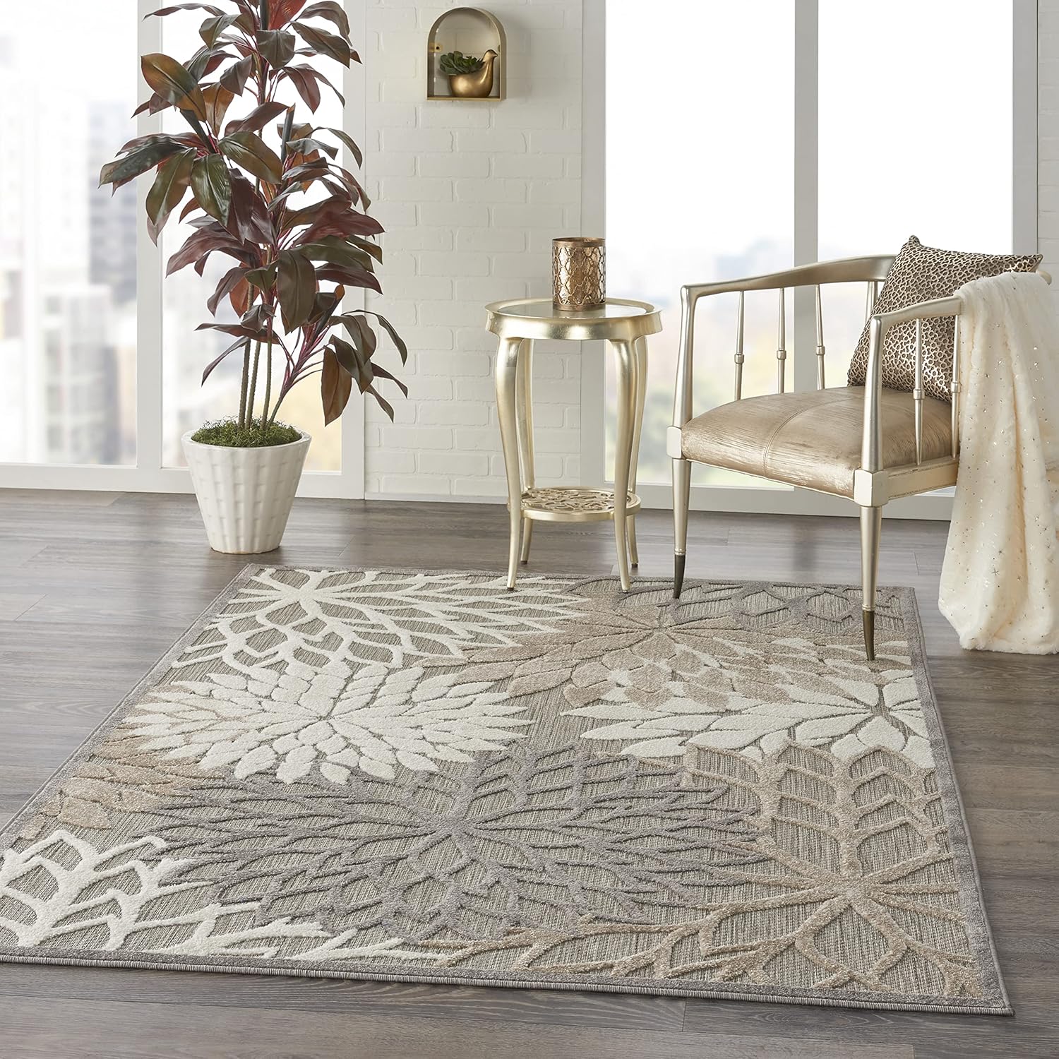 Nourison Aloha Indoor/Outdoor Area Rug 3' 6" x 5' 6", Natural, Rectangular Tropical Botanical Easy-Cleaning Non Shedding Bed Room Living Room Dining Room Deck Backyard Patio