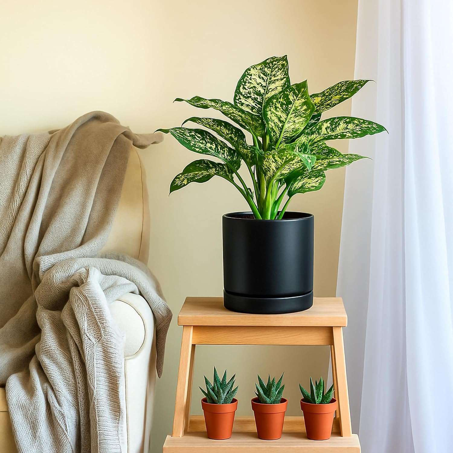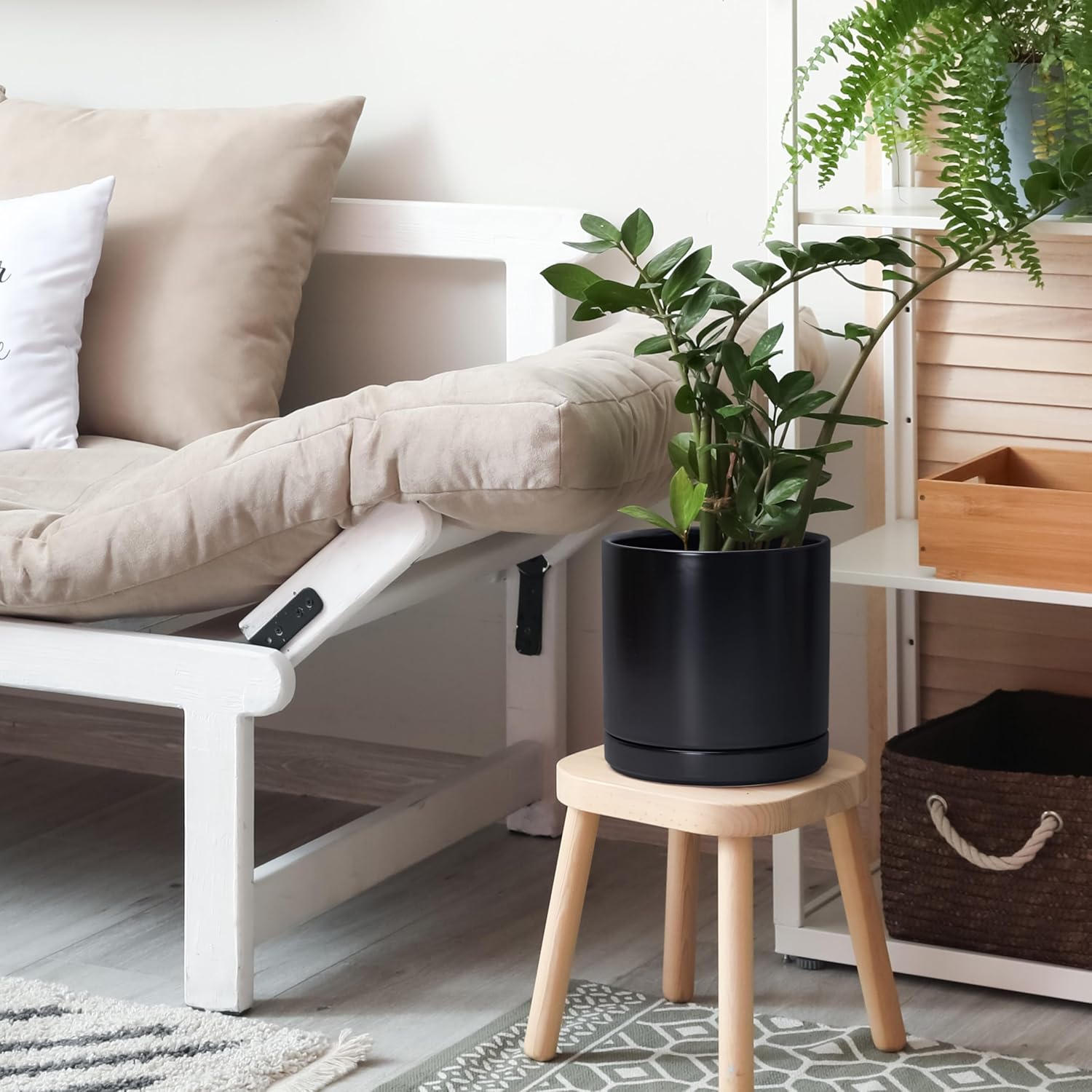 D'vine Dev 6.5 Inch & 8.2 Inch Ceramic Planter Pots for Plants with Drainage Hole and Saucer, Medium Plant Pots Set, Black, 94-G-M-2