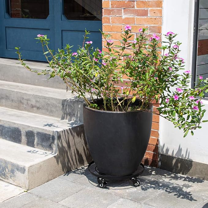 - SIZE & DURABLE POWDER COATED WELDED MATERIAL: Amagabeli metal flower pot caddy is 16 inch in diameter. This round iron planter stand is big enough to hold large and heavy planters or flower pot and moving around your home freely. The iron potted plant stand with wheels is made of rustproof and weather resistant powder coated metal material. Round flower pot rack on rollers is welded with high quality iron that makes this plant saucer with wheels can bear heavier plants pots or other planter.