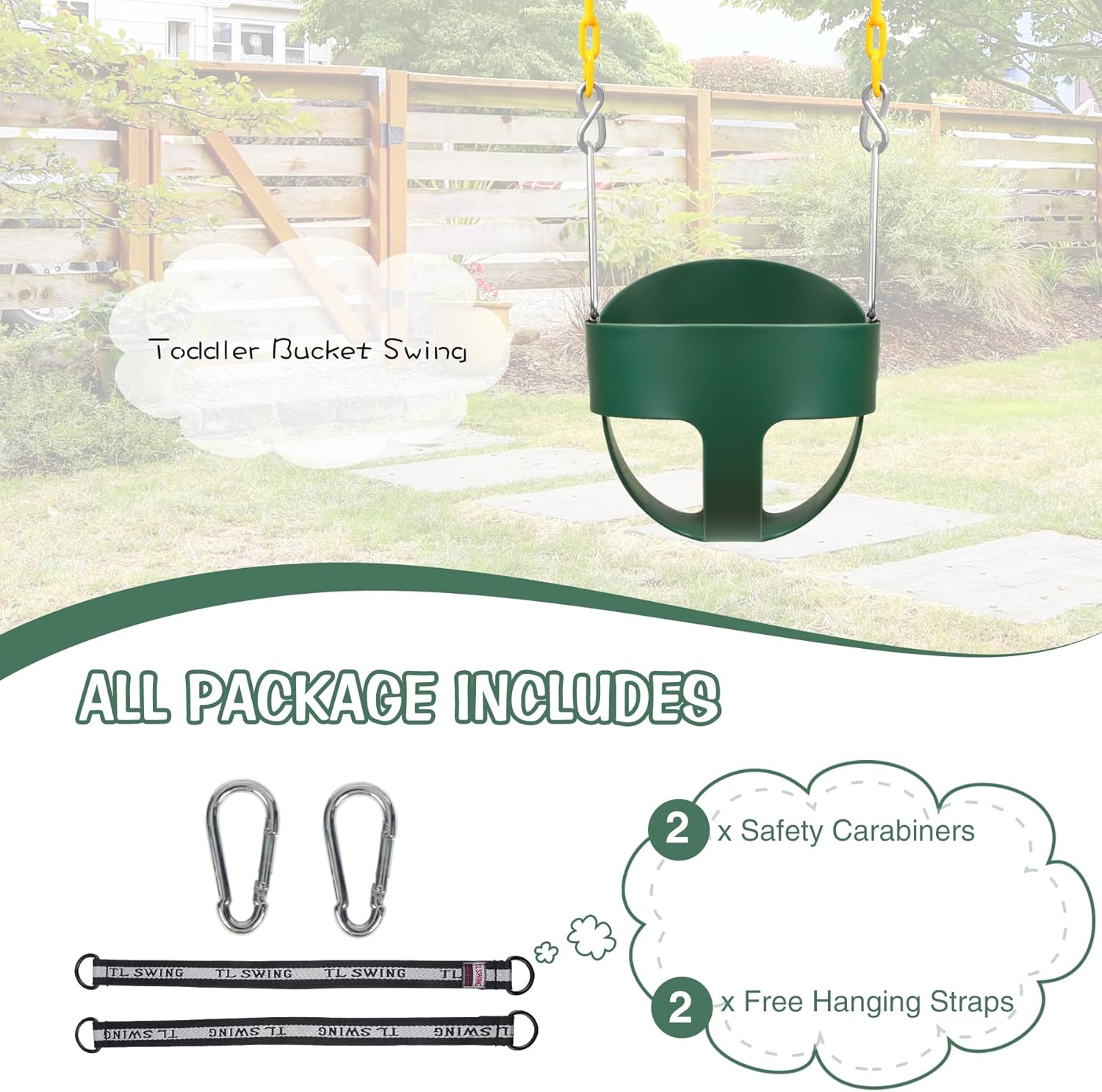 - PREMIUM QUALITY: The High Back Full Bucket Toddler Swing Seat is constructed with durable plastic and heavy duty components. New and improved with updated STAINLESS STEEL hardware with plastic coated chain!