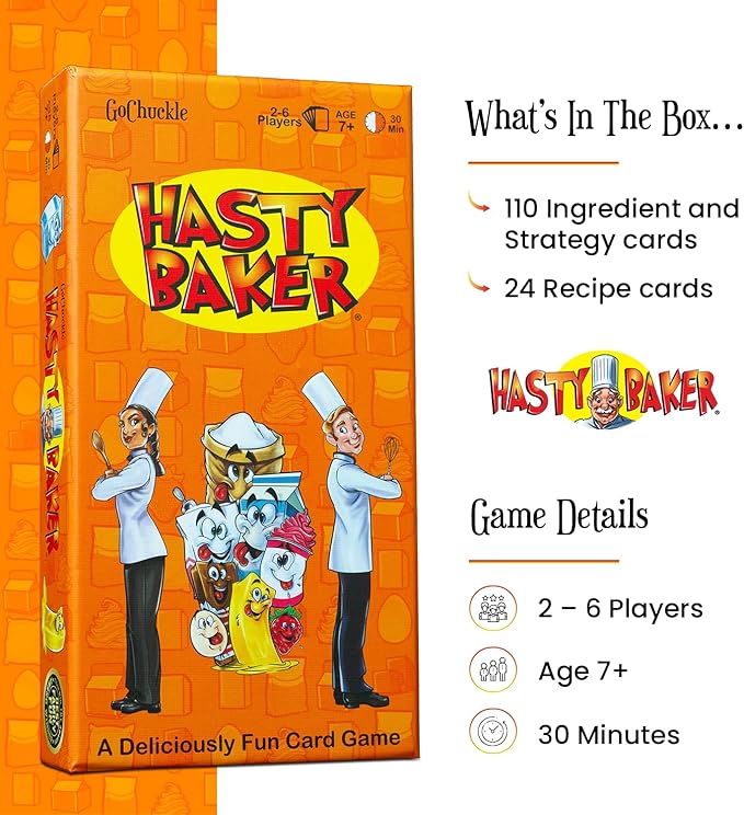 - RECIPE FOR SUCCESS - Hasty Baker was designed with bright, vivid and fun ingredient cards, so kids of all ages will easily identify the cards they need. This entices even your youngest gather the flour, eggs, butter, sugar and other ingredients to create their favorite dessert before other bakers finish theirs.