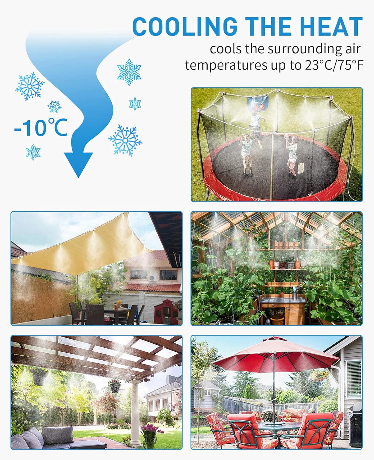 - Wide Application: Misting Cooling Systems widely apply to greenhouse, garden, trampoline, umbrella, livestock, chicken coop and many outside areas