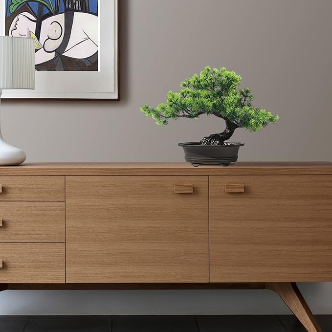 - Artificial plants & greenery fake bonsai is made of plastic, Size chart details: Height 9.5 inches, Width 12 inches (pots height 2",width 6.3"). Recommended for decoration on bookshelfs, tables and windowsills