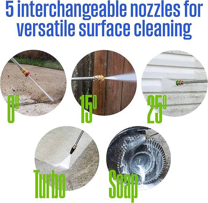- 2300 max PSI (at initial discharge) and 1900 rated PSI of deep-cleaning water pressure; Up to 1.76 GPM (without nozzle at minimum pressure) and 1.2 rated GPM of water flow; Pro-style steel extendable 17.5” wand with quick-connect nozzles (0°, 15°, 25°, turbo and soap applicator)