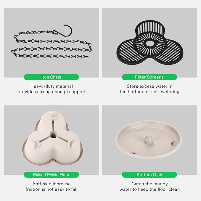 - Flow Design: The water filtration system from top to bottom can effectively save and retain moisture; Meanwhile, the bottom is equipped with a bottom dish that will not stain the ground
