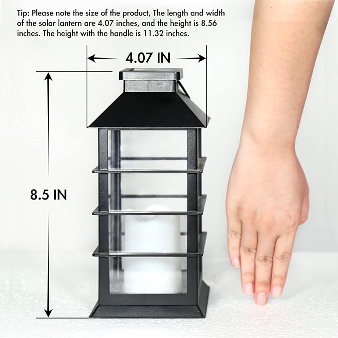 - big surprise on Oct 8-9,2024! the more saving,the more happier-[Cute LED Flickering Flameless Candle] The traditional retro lantern design, flashes like a real candle. The length and width of the solar lantern are 4.07 inches, and the height is 8.56 inches. The height with the handle is 11.32 inches.Tip: Please note the size of the product, you can refer to the picture comparison.