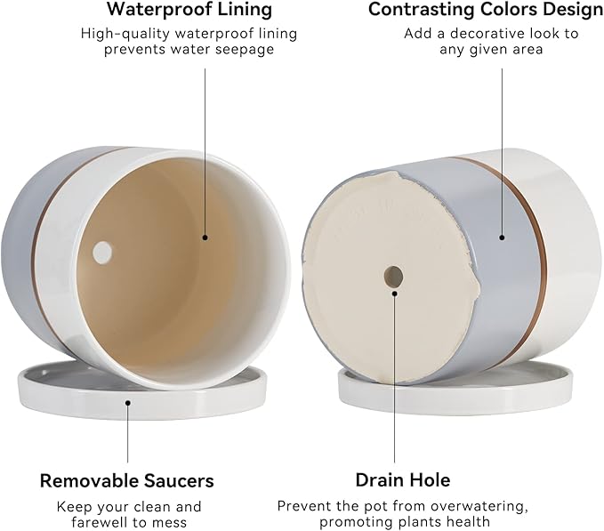 - 【Drain Hole & Saucer Tray】 Comes with a drain hole at the bottom, which can prevents the plant pot from overwatering, promoting plants health, and help them thrive. Saucer base for catching excess water without drips, works well for keep table clean
