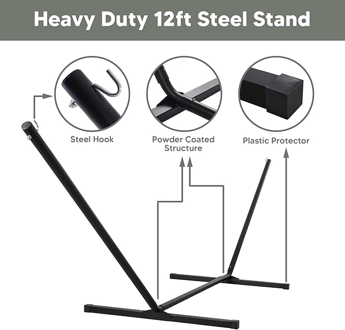 - Hammock with Portable Stand: No damage to trees. Created to be stable and long-lasting, the 12 ft stand is made from powder-coated heavy gauge steel. It can be easily assembled in minutes without any tools, and it could be disassembled easily, making it to be a portable hammock. Feel free to contact us if you have any questions during use within one year of purchase. We are always here to help