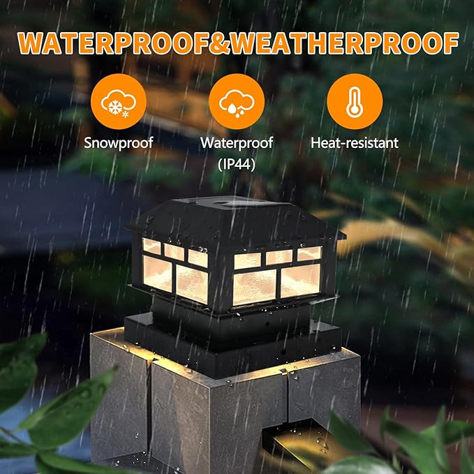 - 【Extensive application scenarios & Weather-resistant】The solar post lights outdoor waterproof IP44 and anti-septic, anti-rust.No worries about rain, snow, frost or sleet. Provide your family a happy time in the garden and beautiful garden party with your friends.Don't Hesitate About Color Selection Anymore. solar post caps lights With dual light sources, you can use the warm light to add a cozy ambiance to your patio, or the bright white light for a modern look.