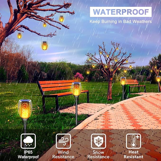 - Weatherproof and Durable: The exterior of our outdoor waterproof solar torch lamps is made of high-grade, upgraded ABS materials, ensuring its longevity and high-quality performance, durable and IP65 Waterproof. These products can withstand all weather conditions, including rain, snow, and frost, and are perfect for outdoor activities
