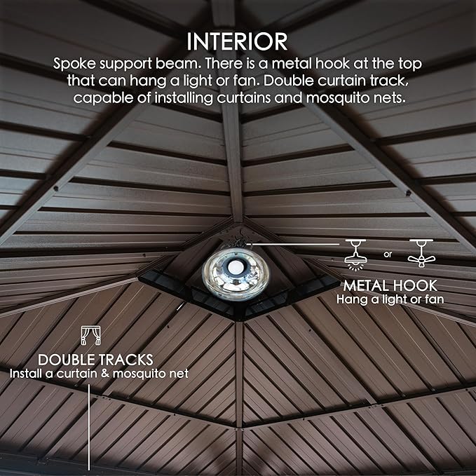 - ✅Two hooks have been specially crafted to accommodate fans or lights, enhancing the ambiance of your gazebo and making it a comfortable and inviting space.
