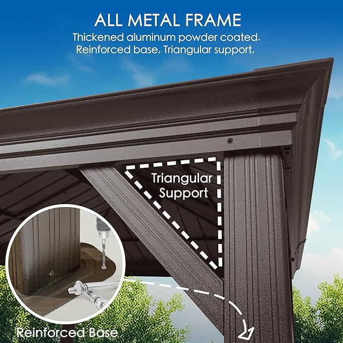 - ✅Strong Structure Hardtop Gazebo - This gazebo features 4.7” x 4.7” triangular poles and 5” x 4” beams, providing a solid foundation, ensuring both stability and longevity. Complemented by a galvanized steel roof and a sturdy frame, the gazebo offers unparalleled support. It is capable of withstanding snow loads of up to 2500 lbs and wind speeds of up to 40 MPH.