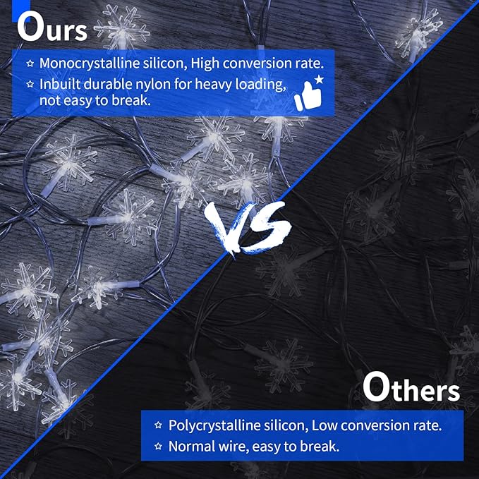 - 【Efficient Solar Snowflake String Lights】The solar Christmas lights equipped sophisticated and 180 degree adjustable monocrystalline silicon solar panel with inbuilt 800mAh rechargeable battery; When the built in NiMH battery saves enough solar energy in the daytime, the string lights can automatically work for 8 to 10 hours at night, no extra utility electric cost.
