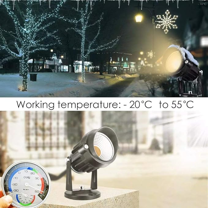 - 【IP65 Waterproof & Durable】Thick aluminum body,anti-corrosion poly-carbonate material lamp cap and spike and lens cover design withstand rainy and snowy weather; IP65 waterproof design which greatly improves the stability of outdoor spot lighting and long-term use.