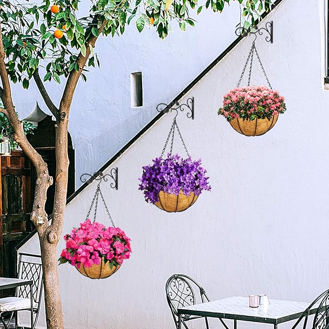 - Natural & Durable Material: For our metal hanging flower basket with pot liners for plants, the coco liners for planters are made of 100% natural coconut fibers which has good air permeability and water retention; the frame and hanging basket chain are made of iron with powder-coated to prevent rust, which is strong and durable. So you can rest assured to use them outdoors