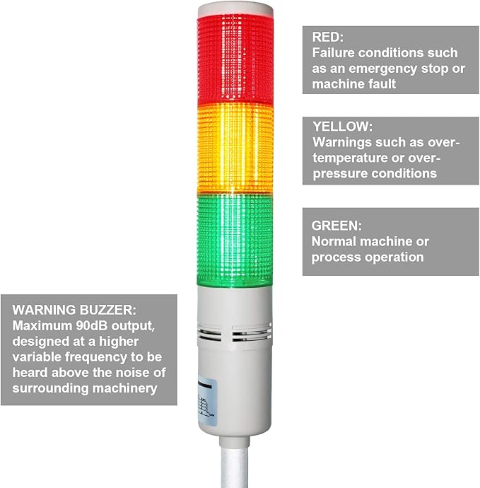 - Each level equips 3x3 continuous light LED chips in 3 different directions, 90dB hi-frequency buzzer alarm optional for adding an audible warning to be heard above the noise of surrounding machinery