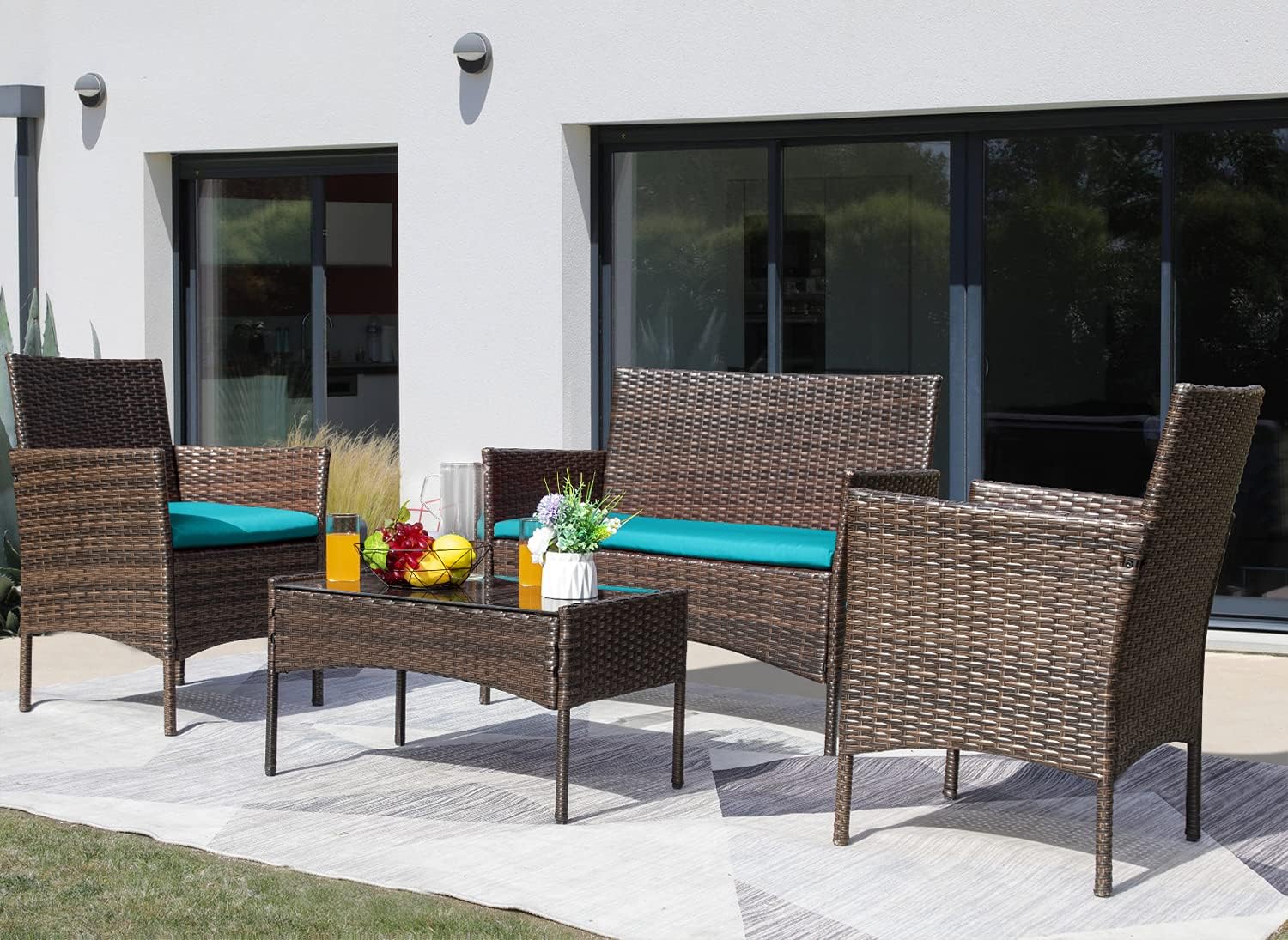 Greesum Patio Furniture 4 Pieces Conversation Sets Outdoor Wicker Rattan Chairs Garden Backyard Balcony Porch Poolside loveseat with Soft Cushion and Glass Table, Brown and Blue