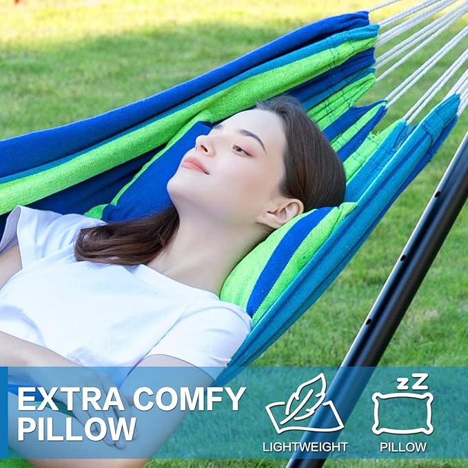 PNAEUT Double Hammocks with Stand for Outside, Portable Space Saving Heavy-Duty Steel Stand for Indoor Outdoor Patio with Carrying Bag, 450 lbs Capacity (Blue)