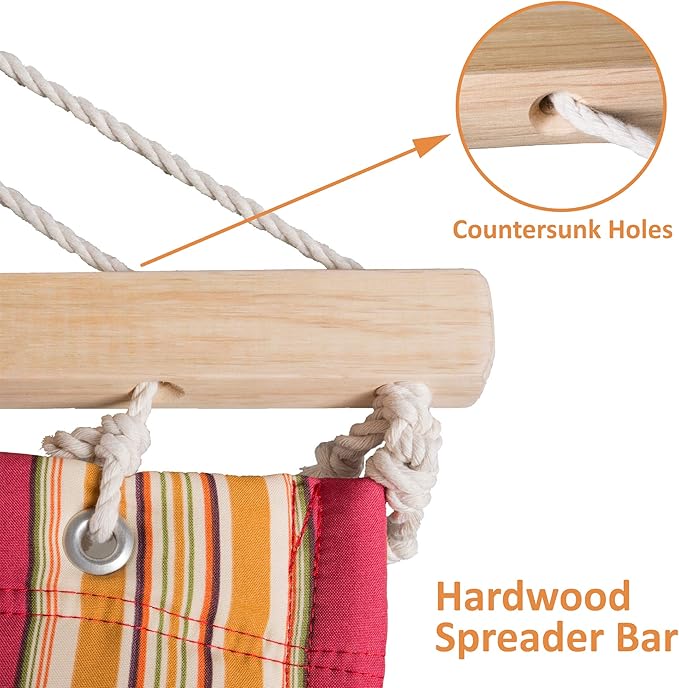 - Hardwood Spreader Bar & Balance Ropes: 55 inch hardwood spreader bars are more stylish and stable, offering you a comfy nap without the anxiety of falling down. It features countersunk spreader bar holes that reduces the friction between rope and wood. Comes with balance ropes, SUNCREAT hammock combo cares more about your safety. Don’t need to worry about flipping over any more