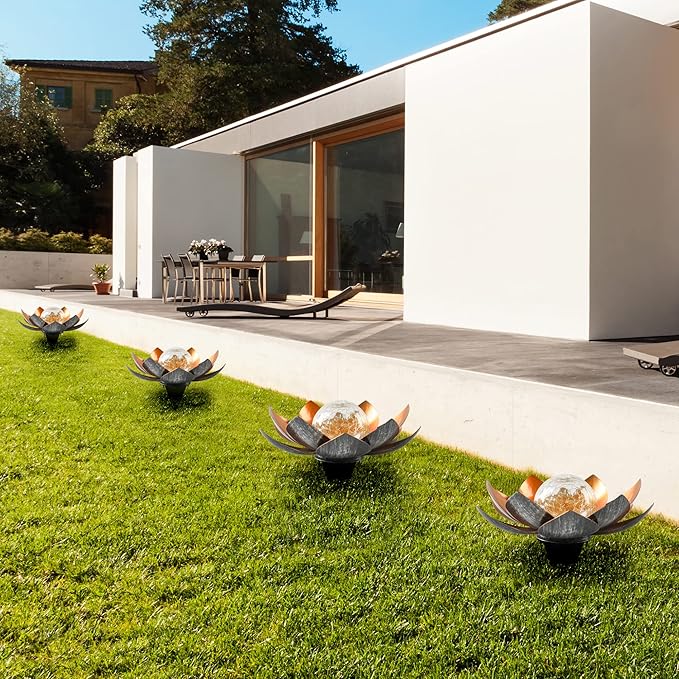 - [Romantic decoration] At night, they emit a warm white glow, bringing a charming decorative effect to your garden at night. The beautiful lotus shape and subtle water ripple patterns are displayed on your terrace in a special way, and the beautiful visual effects create a romantic atmosphere. This is your preferred gift for family and friends